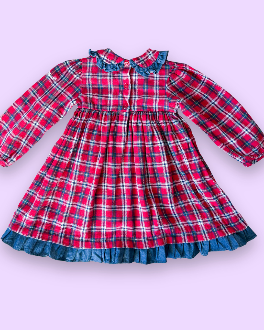 – Sold OutGorgeous vintage OshKosh tartan dress with pretty frill collar, embroidered flowers and denim frill hem....
